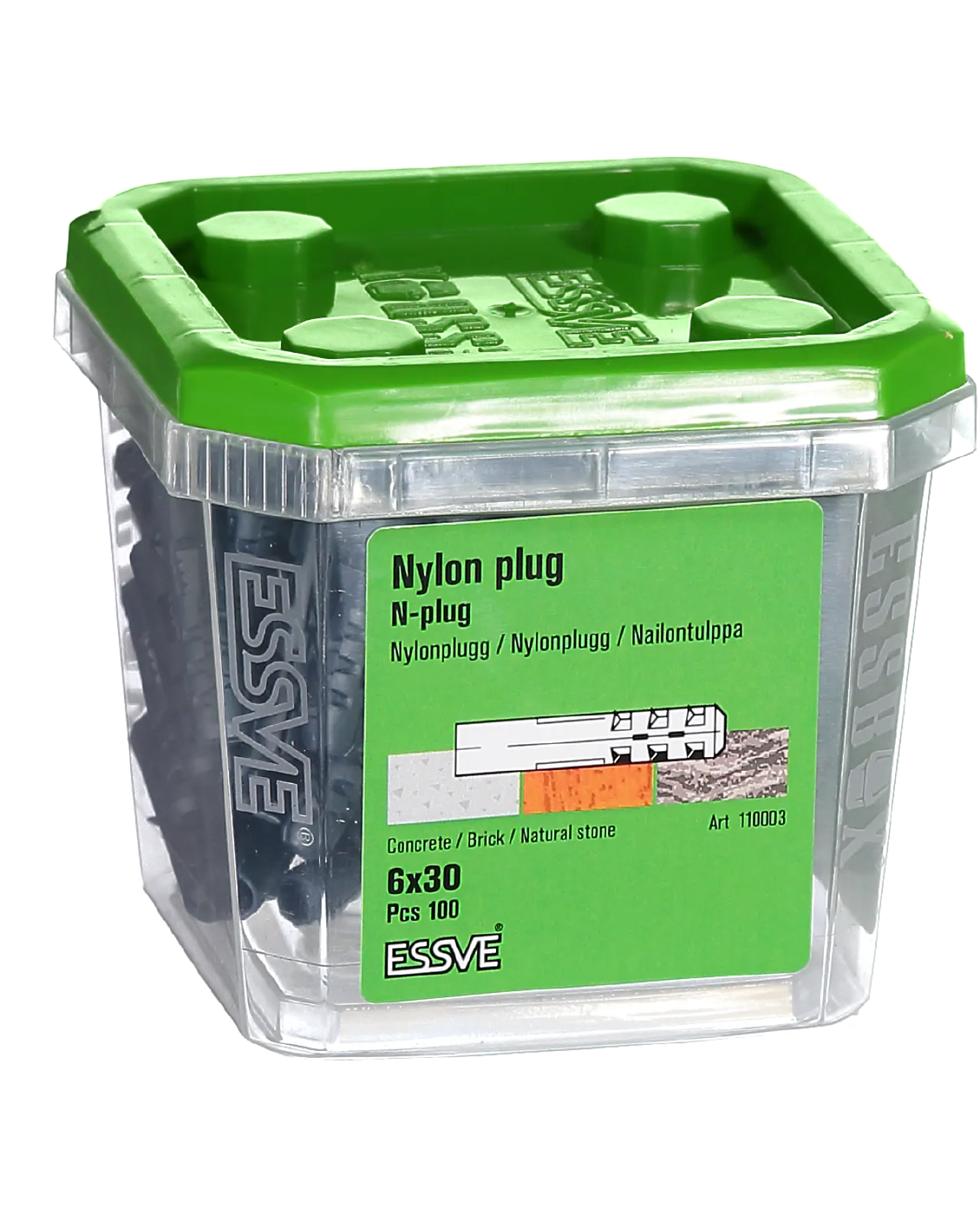 ESSVE Nylonplugg NL brukes ved porøse materialer som lettbetong og leca, siporex etc Utovergående vinger hindrer Nylonpluggen fra å rotere. Nylonpluggen har ingen krage, noe som gjør den godt egnet for gjennomstikkmontering. Gjennom sin rettede ekspansjon er Nylonpluggen godt egnet for montering i tynne og porøse materialer. Dimensjonene 8, 10 og 12 mm finnes i en ekstra lang versjon NL, som fungerer utmerket i porøse materialer. Pluggen er produsert i høyverdig nylon, som er upåvirket av temperatur