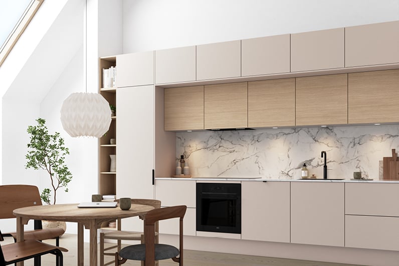 AUBO produseres i Vest-Jylland med kortreist tre og energieffektive prosesser, sertifisert iht. de strengeste bærekraftstandardene. Resultatet er solid dansk design med rene linjer, smart funksjonalitet og lang levetid – et kjøkken du kan levere med stolthet, og som kunden vil leve med i mange år.