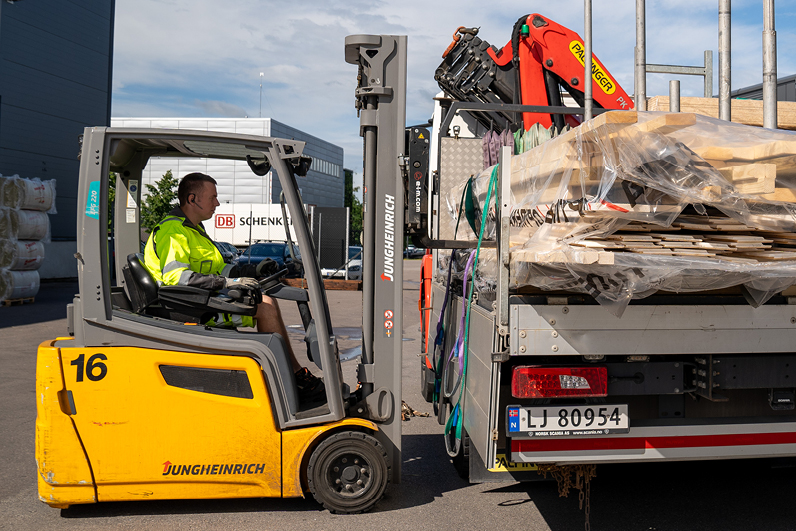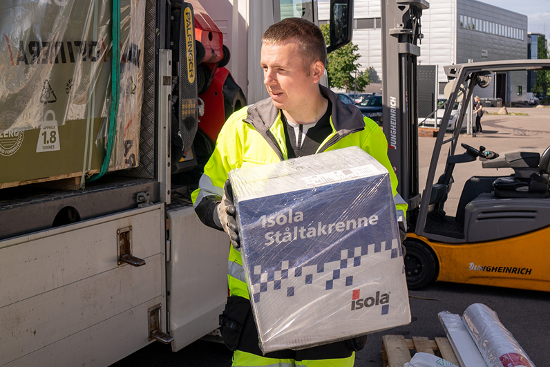 Varene som skal med på første tur står allerede klare når Kristoffer ankommer Optimera sitt logistikksenter på Barkåker i Vestfold. Kristoffer er også truckfører og foretrekker å laste bilen selv. Han kjenner bilen best og er opptatt av at byggevarene lastes i riktig rekkefølge og på en sikker måte.