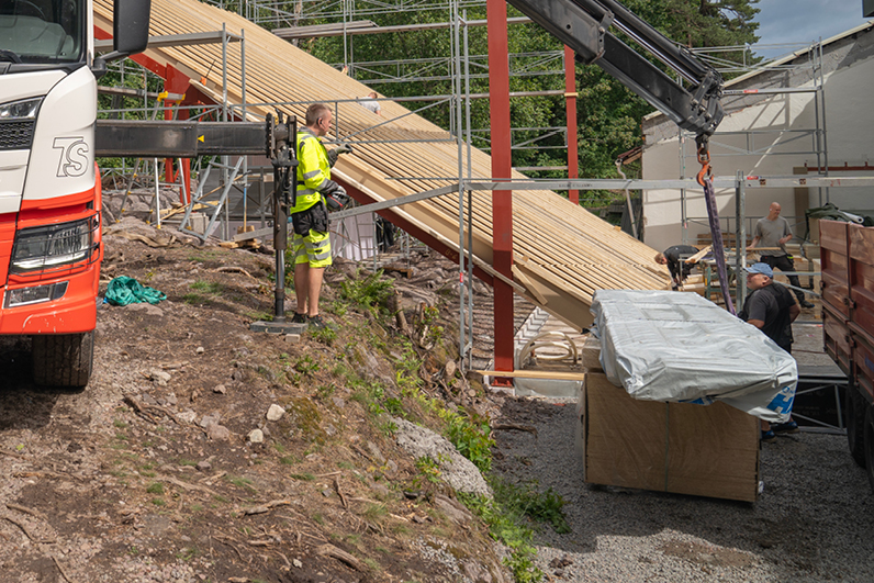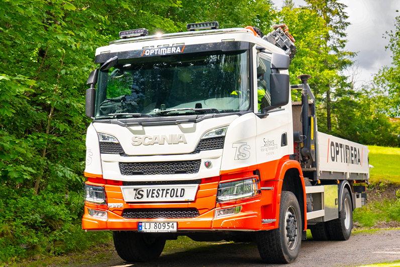 Vel framme i Grenaderveien i Tønsberg hvor byggmester Bjarne W. Sørensen jobber med et tilbygg til Wang Toppidrett, bestemmer Kristoffer seg for hvor det er best å plassere bilen. Bilen har firehjulstrekk og luftfjæring bak, som kjenner etter hvor mye vekt det er på bilen til enhver tid. Er det mye vekt bak, gir dette også vesentlig bedre løftekapasitet til krana, som på denne bilen er en 15 meter lang 19 tonnmeter.