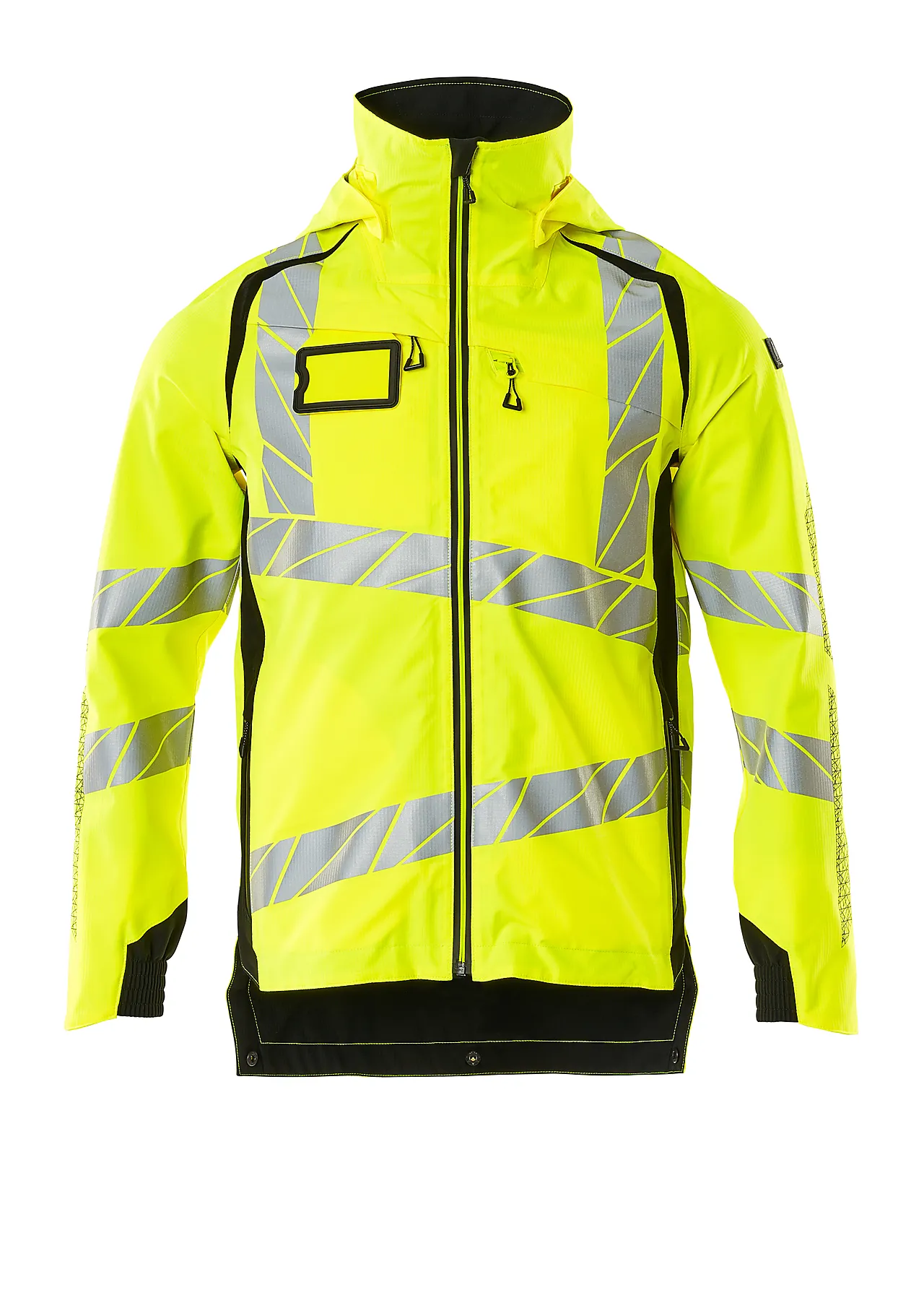 Fluoriserende og med loddrette og skrå, tverrgående reflekser. Tofarget. God pusteevne samt vind- og vanntett. Sømmer er tapet. Hetten er avtakbar, foret og har regulerbart strikksnøre. Lukking med vanntett glidelås og innvendig vindfang. Innerlommer - to med glidelås og en åpen i nett. ID-kortholderen kan tas av. Brystlomme med vanntett glidelås. Forlommer med vanntette glidelåser. Høy krave. Innvendig ribb i nederste kant foran på jakken. Ekstra stoff nederst på ryggen kan brettes ned ved hjelp av knapper, og gir ekstra lengde bak og derved også beskyttelse mot vind og vær. Strikk ved håndledd. Med printeffekter.