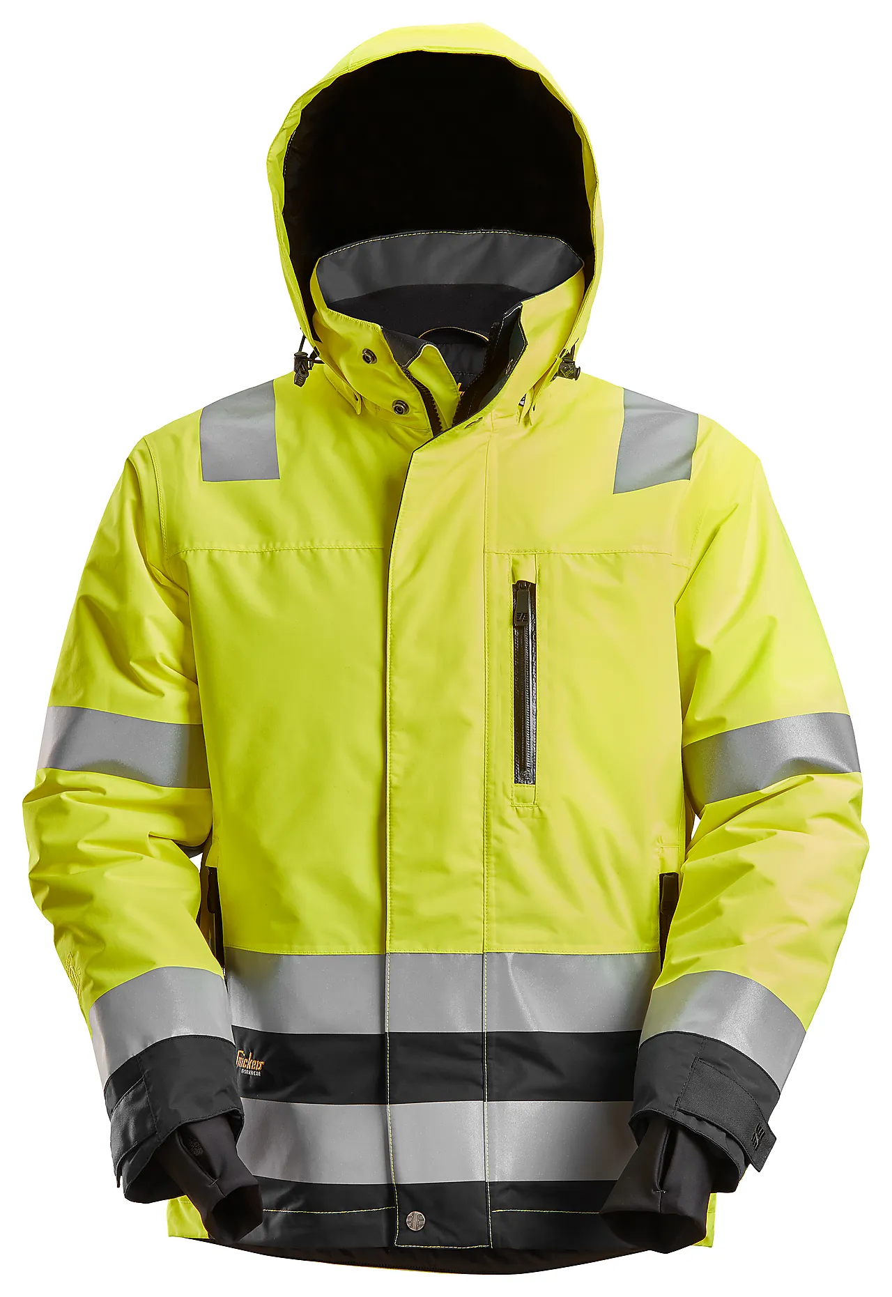 Snickers 1132 vinterjakke er en vanntett og varm arbeidsjakke velegnet for alle typer arbeid under kalde, våte og mørke forhold. Jakken er utstyrt med refleks for optimal synlighet og økt sikkerhet, og er klassifisert i henhold til EN 20471, synlighetsklasse 3. Den er produsert i et pustende tolags skallstoff som holder deg tørr og komfortabel under tøffe værforhold. Innvendig polstring sammen med 3D-nettingfôr på baksiden sikrer effektiv isolasjon. Stretchpaneler på baksiden av skuldrene gir god passform og optimal bevegelsesfrihet. Ermene er formsydde med Cordura-forsterkede albuer for økt slitestyrke. Hetten kan tas av samt justeres.
