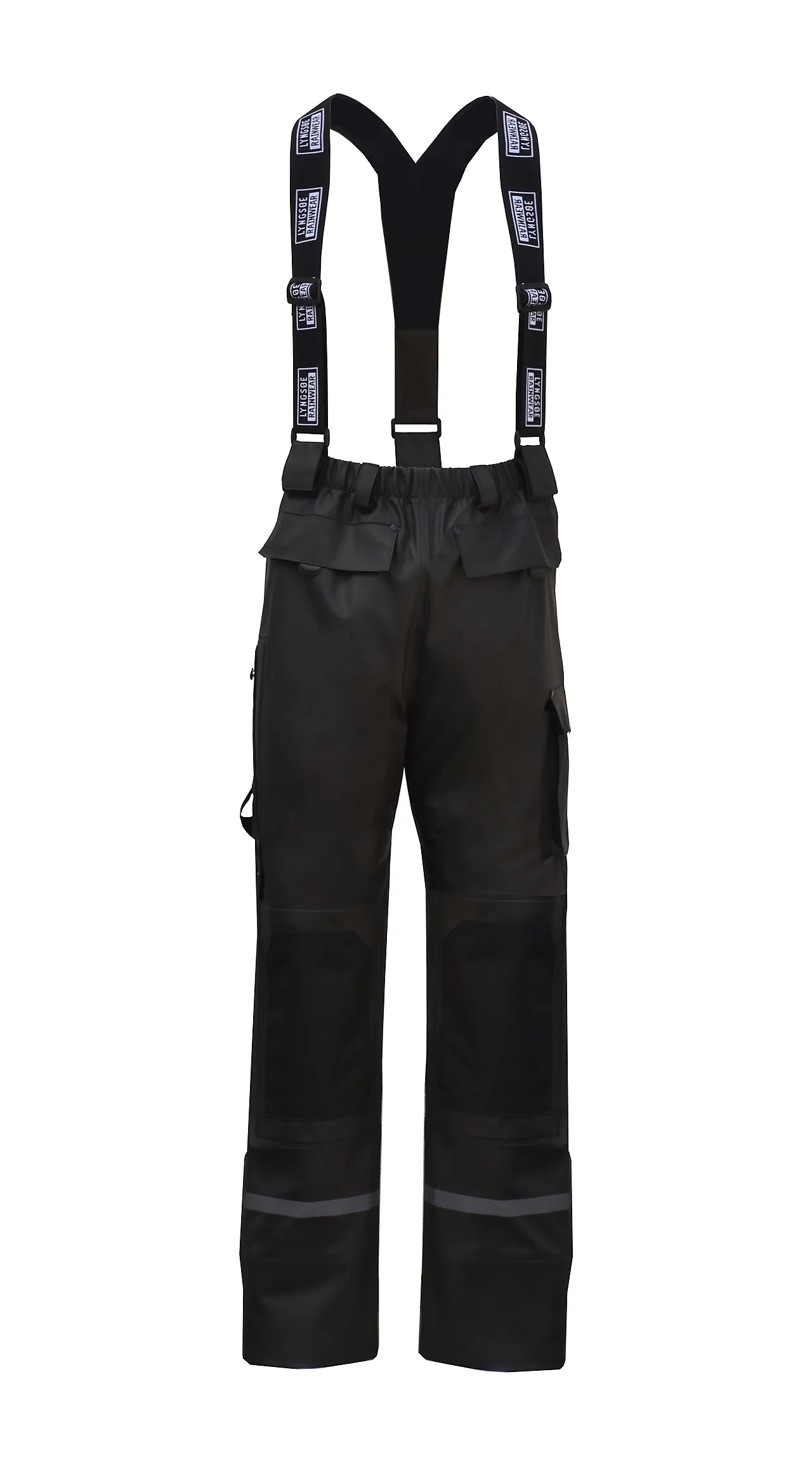 Regnbukse med stropper, stoff i sterkt PU/PVC og av god kvalitet. Stroppene er brede for økt komfort og kan justeres til ønsket lengde. Buksen har komfortabel passform og praktiske lommer foran og på siden. Reflekser nederst på bena for bedre synlighet i mørket.