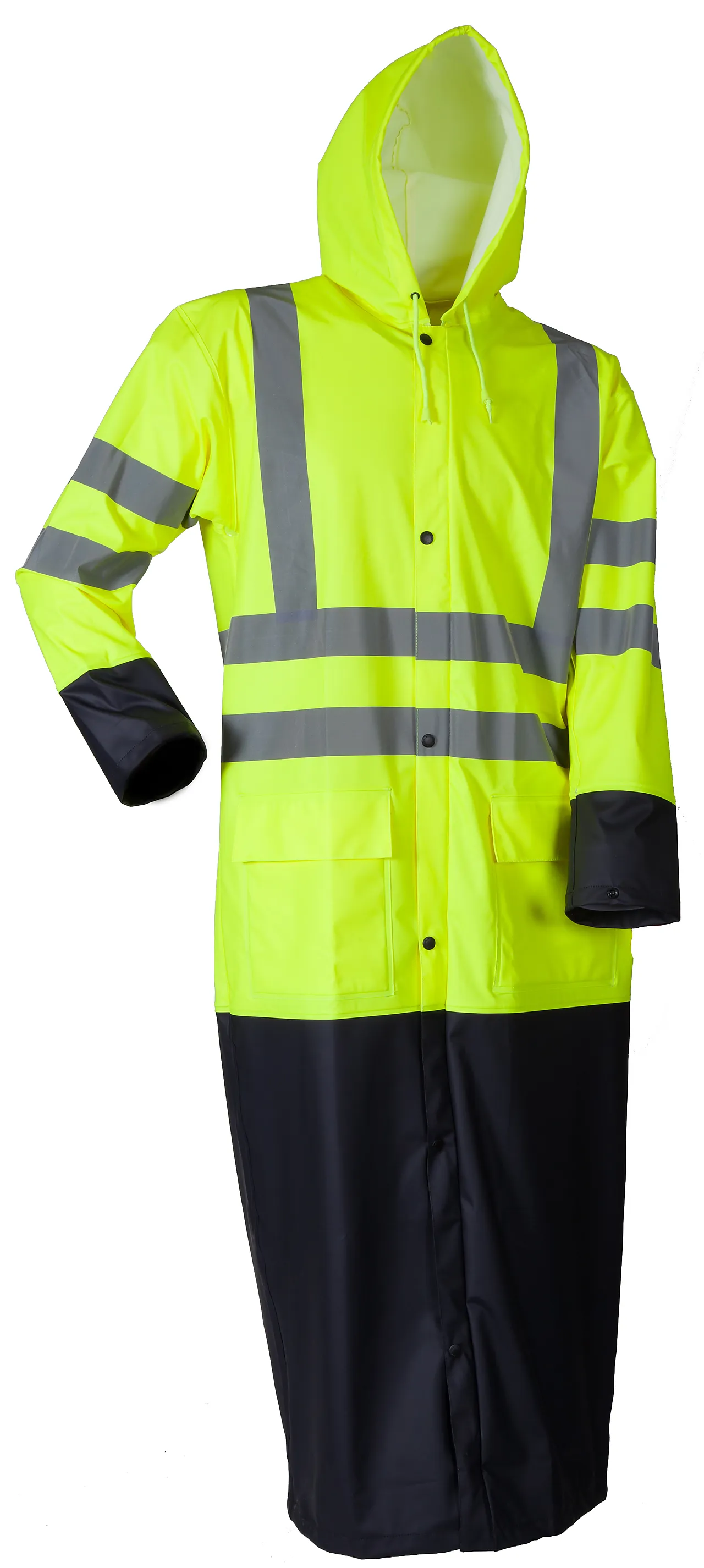 Regnfrakk LR8085 fra Lyngsøe Rainwear. Regnfrakken er laget i PU-kvalitet (190 g/m2), og er vind- og vanntett. Jakken har en fast hette med snor, to utvendige lommer, skjult glidelås fra midjen og opp og dryppkant nederst. Enkelt å justere passformen med trykknapper ved håndleddene.