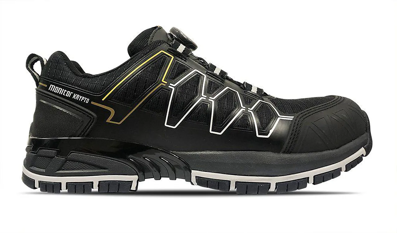 Monitor Krypto Boa er en vernesko i sporty utførelse som ikke bare ser ut som en sportssko, men som også har passform og komfort som en sportssko. Overdelen har Boa Fit-system som gjør det svært enkelt å ta skoen på og av. Overdelen har en vanntett Monitex-membran og et slitesterkt Ribstop-materiale, og på tå og hæl er det kraftigere TPU-beskyttelse for å forsterke skoen ytterligere. Yttersålen er Monitors nye SIGMA, som har en yttersåle i gummi med et mønster som sikrer godt grep på de fleste underlag. Den har også mellomsåle i dempende EVA med en kraftig torsjonsgaffel som øker stabiliteten ytterligere. Tåhetten er bred og fremstilt i aluminium. Skoen har også Monitors SS2.0 innersåle.