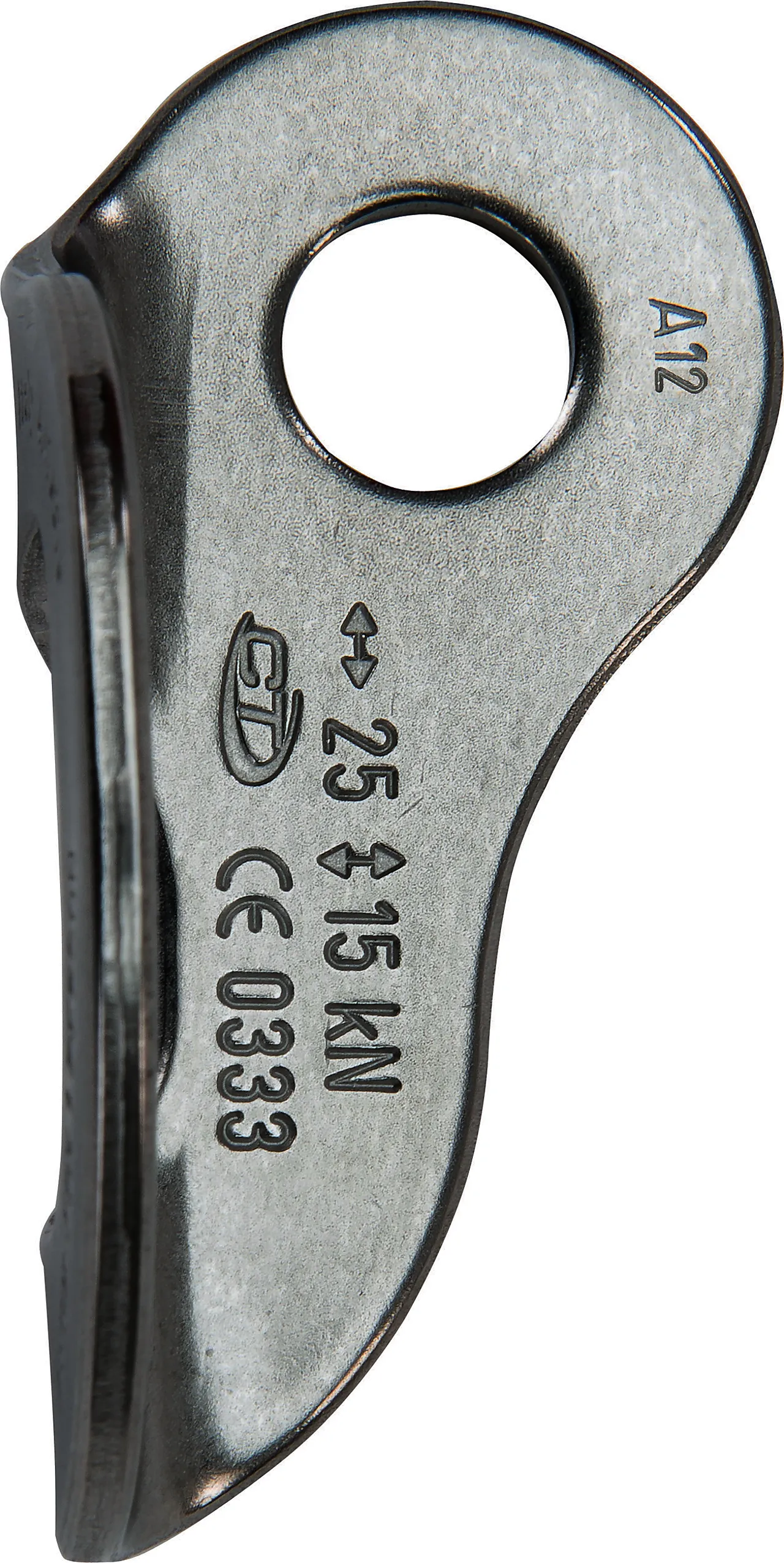 Forankringspunkt med hull for karabin 18x28mm. Spesifikasjoner: Rustfritt stål AISI 316, lengdestrekk 25kN, tverrstrekk 15kN, og vekt 42g. Bultdiameter M12 (inngår ikke). Samsvarer med EN 959:200.