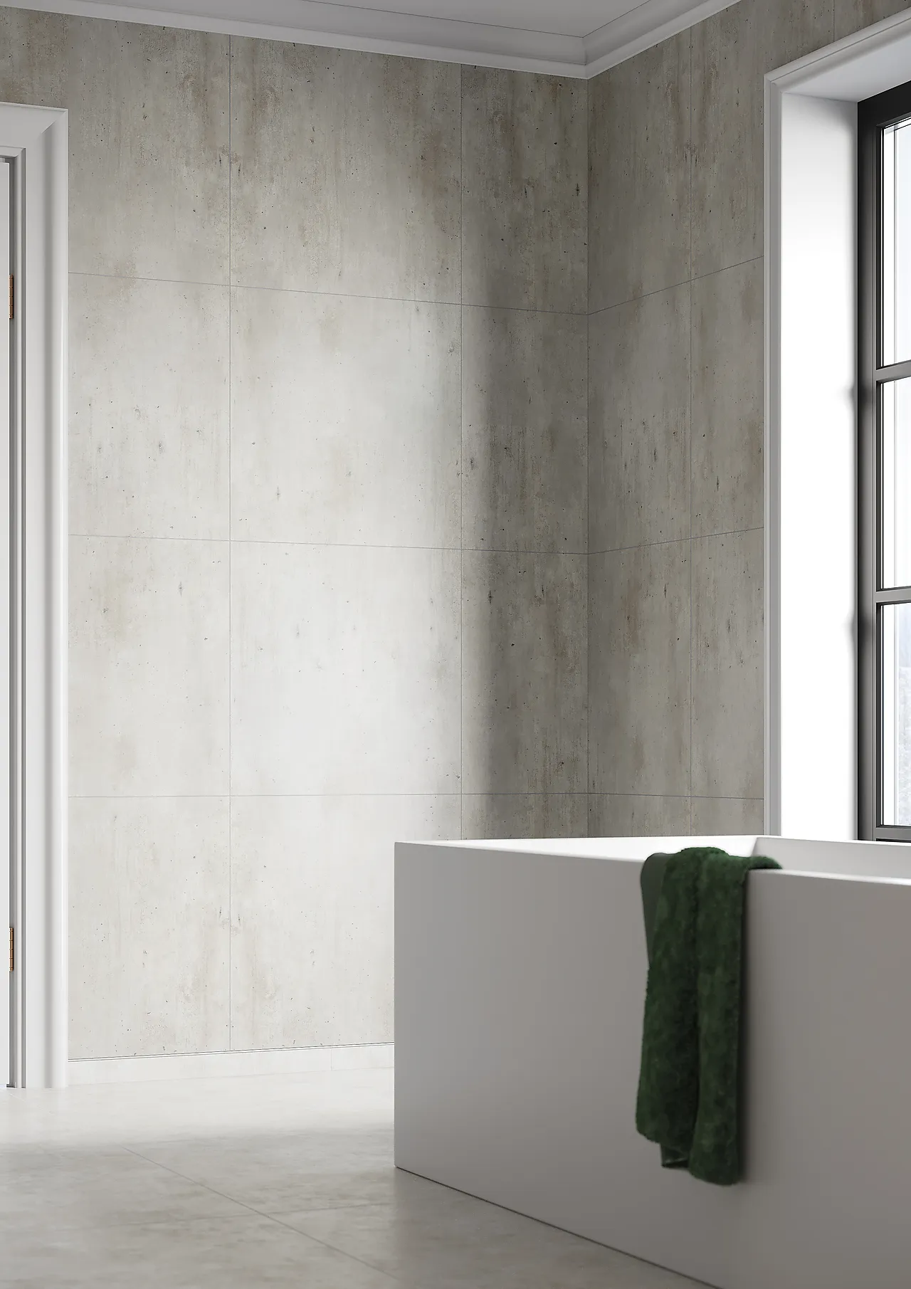 Fibo Marcato baderomsplate med eller uten flis, platene ligner sement og fargen er enkel å kombinere med andre farger. Dette er et moderne og trygt fargevalg. Fibo baderomspanel monteres enkelt på eksisterende vegg eller rett på stendere. Den slette overflaten gjør det enkelt å holde rent. Allsidige plater som også kan brukes i andre rom som garderobe eller vaskerom. Lekre plater som gir et helhetsinntrykk i rommet.