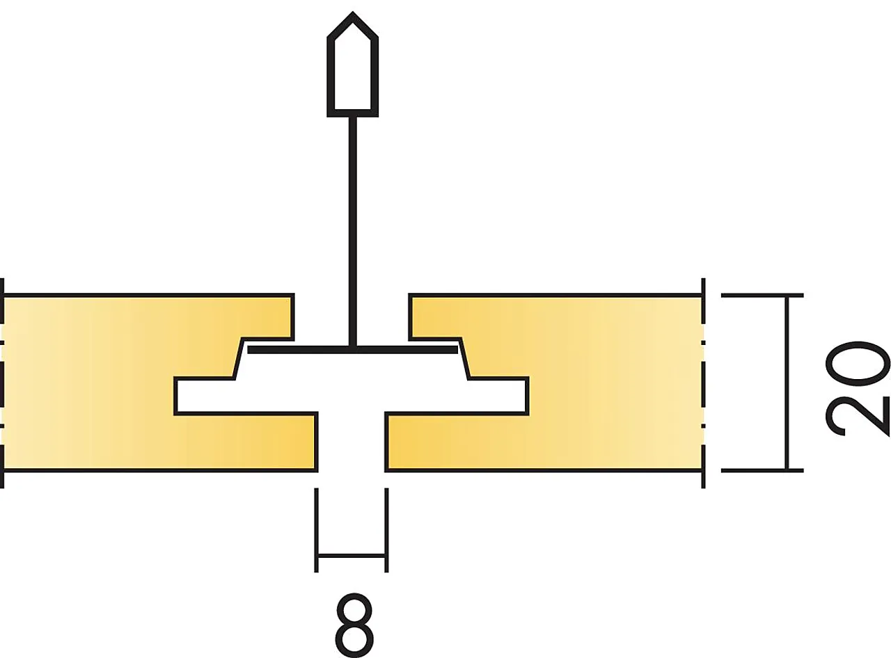 20 mm himlingsplate med malt hvit overflate, Akutex FT. Kan leveres i farger. B-kant limes direkte mot taket. Faset kant gir en 4 mm fuge i skjøten mellom platene.