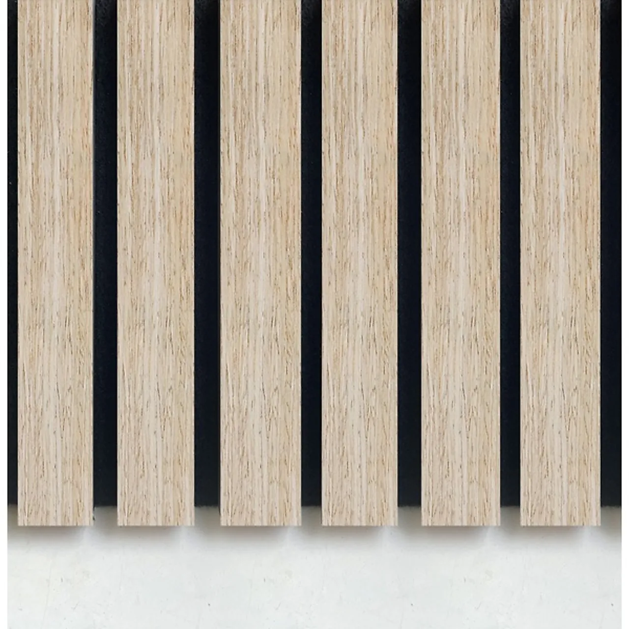 Et elegant og funksjonelt spilepanel, ferdig montert og klart til bruk. Panelet består av spiler i 3-sidig eikefinér på 15mm tykk MDF, 45mm brede spiler montert på en plate med en spalteavstand (CC) på 15 mm, noe som gir et moderne og stilrent uttrykk. Platen har en 8 mm gjennomfarget sort filtplate, som gir en eksklusiv finish og gjør den enkel å tilpasse ditt interiør. Panelet leveres i faste lengder, men kan klyves og kappes etter behov, slik at det enkelt kan tilpasses veggens størrelse og form. Monteringssystemet er laget for enkel overlapping mellom platene for en sømløs installasjon. Perfekt for å skape en varm og estetisk atmosfære i hjemmet eller på kontoret.