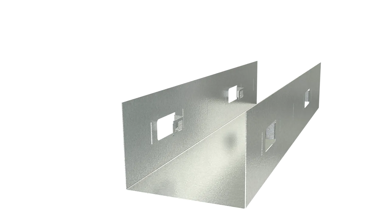 Skinne med utstansede låsemekanismer med 150 mm mo dul. Standard stendere klikkes på plass med ønsket senteravstand.