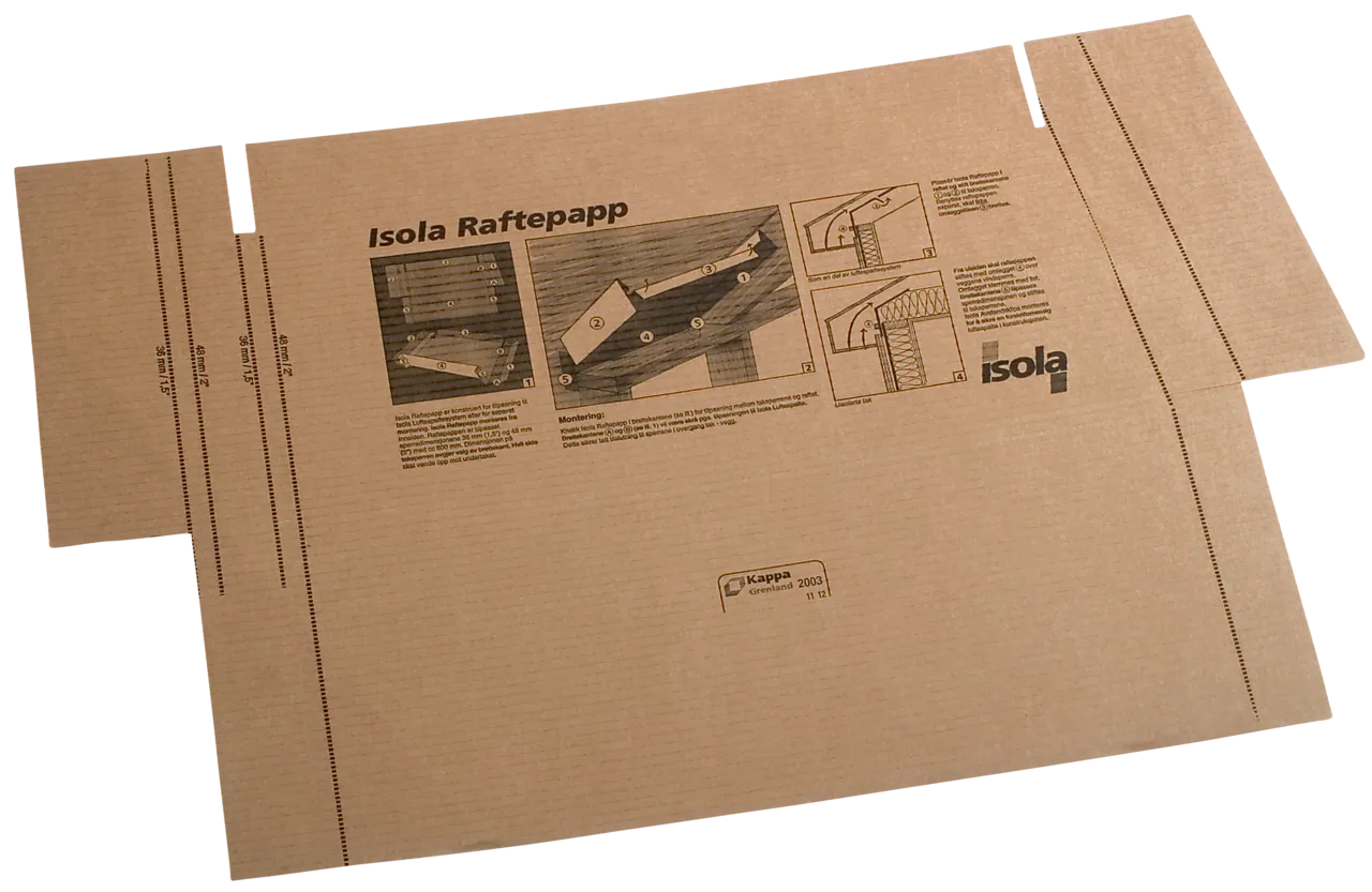 Isola raftepapp for isolasjon. Benyttes som startsplate ved bruk av Isola Luftespalte og brukes i raftet.