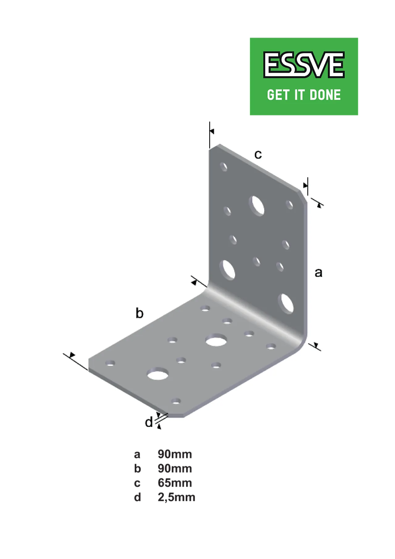 ESSVE Vinkelbeslag, type 70, 90 eller 105 brukes ved forankring av krysslagte stenderverk og konsoller ved oppføring samt mellom tre bjelker og sviller.