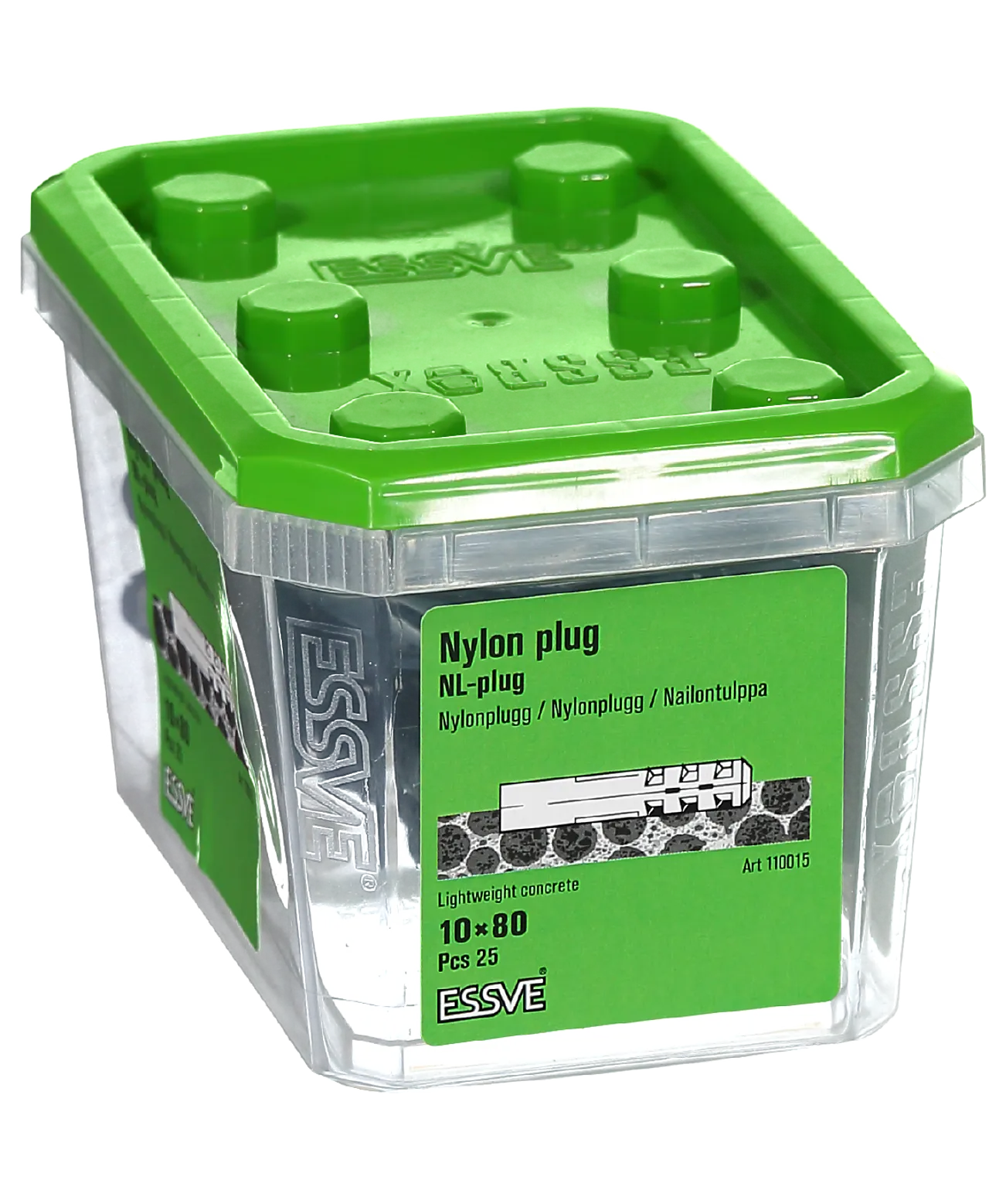 ESSVE Nylonplugg NL brukes ved porøse materialer som lettbetong og leca, siporex etc Utovergående vinger hindrer Nylonpluggen fra å rotere. Nylonpluggen har ingen krage, noe som gjør den godt egnet for gjennomstikkmontering. Gjennom sin rettede ekspansjon er Nylonpluggen godt egnet for montering i tynne og porøse materialer. Dimensjonene 8, 10 og 12 mm finnes i en ekstra lang versjon NL, som fungerer utmerket i porøse materialer. Pluggen er produsert i høyverdig nylon, som er upåvirket av temperatur