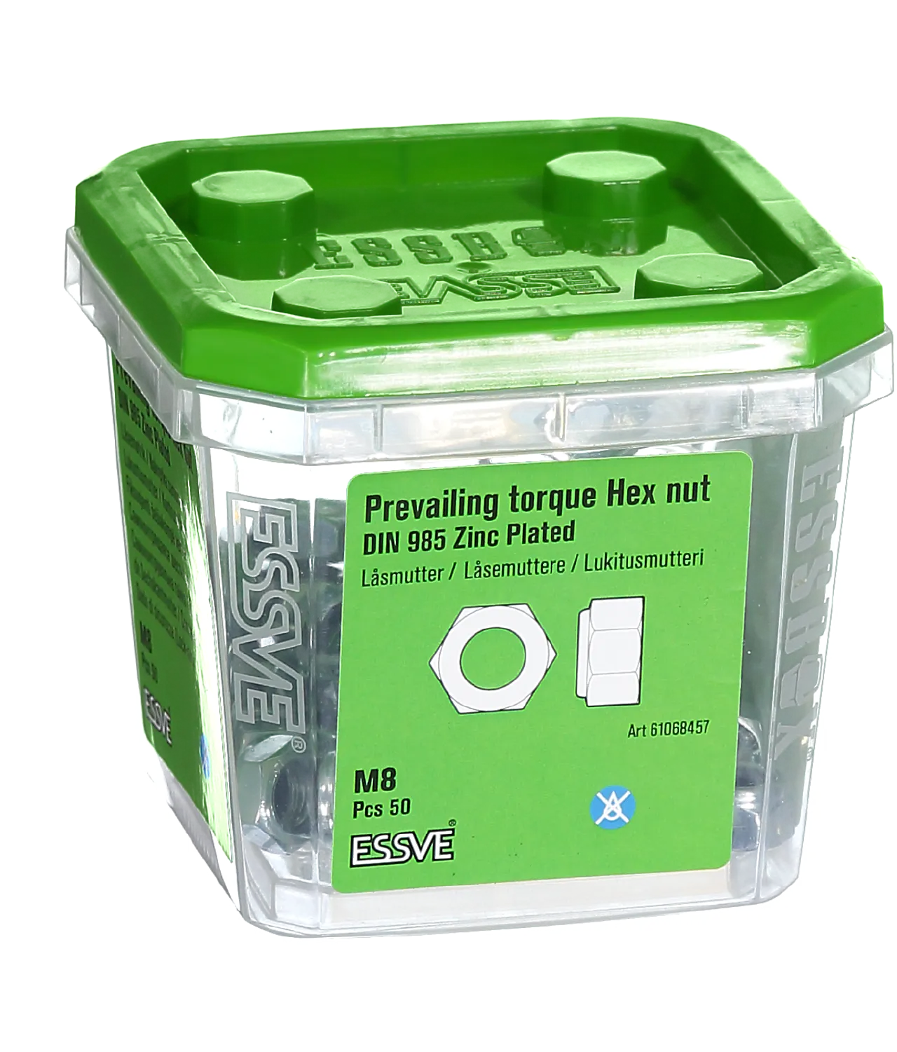 ESSVE Låsemutter, lav sekskantet nylonlåsemutter, beregnet til montering der en viss låsing av enheten er ønskelig. Produsert i herdet stål med blankforsinket overflatebehandling for innendørs bruk. Utstyrt med en nylonring som fester seg til skruen/gjengestangen ved innskruing. Følger DIN 985 standard.
