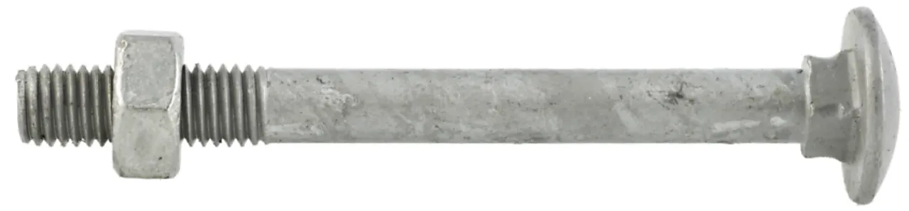 Låseskrue DIN603 med mutter DIN555 varmforsinket. Kvalitet 8.8, delgjenget. Bruksområde: Tre mot tre og beslag i tre. Korrosjonsklasse: C4 - Utendørs: Industri og kyststrøk med moderat saltinnhold. Innendørs: Kjemiske bedrifter, svømmebasseng, skipsverft, båtbyggerier.
