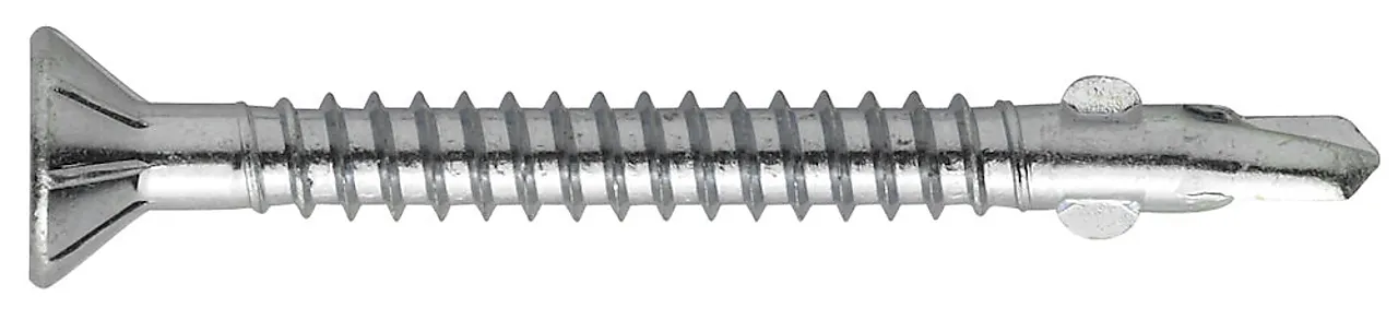 Til montering av tre på stålprofil uten forboring Undersenket hode med freseribber gir et godt resultat Selvskjærende gjenge skjærer seg inn i stålprofilen uten forboring opp til 2,5 mm Skruens spiss er utformet som et lite bor. Vingerne knekker av, når de treffer stål.