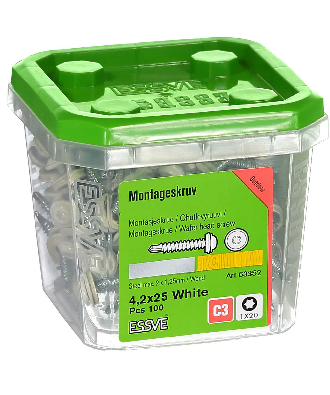 ESSVE montasjeskrue med tetningsskive beregnet for montering av vannbrett, vindskiplate mot underlag av tre, eller tynnplate mot tynnplate i konstruksjoner utendørs. Skruen er produsert i herdet stål med 20u blankforsinkning, tetningsskiven er produsert av rustfritt stål A2 med svart EPDM tetning. Skrue og tetningsskive er pulverlakket i de mest vanlige fargene. Lavt panhode og TX bitsspor. Skruen har redusert borspiss, er selvborende og gjengepressende, borkapasitet i stål 2x1,25 mm.
