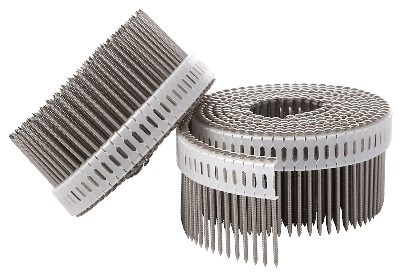 Paslode syrefast (A4) ringet spiker på plastbåndet, IN-coil. IN systemet eliminerer problemet med flygende trådrester. Maskinspikeren passer ypperlig til montering av panel, plater, bindingsverk, utlekting, mm.