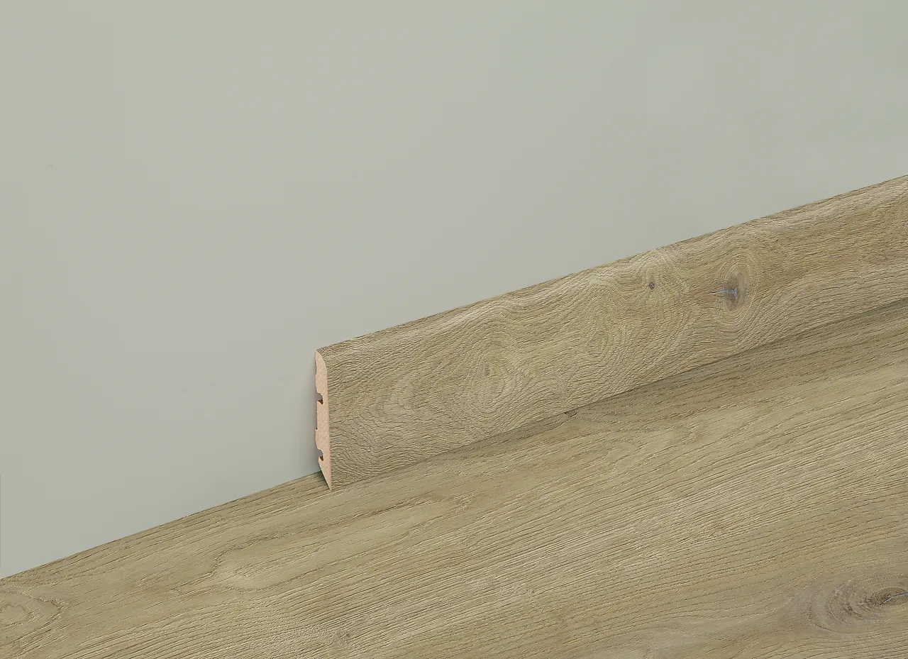 NOBB 45486586 - Artikkelnummer 101145962Sokkellist 14/60 2400 mm eik myk grå