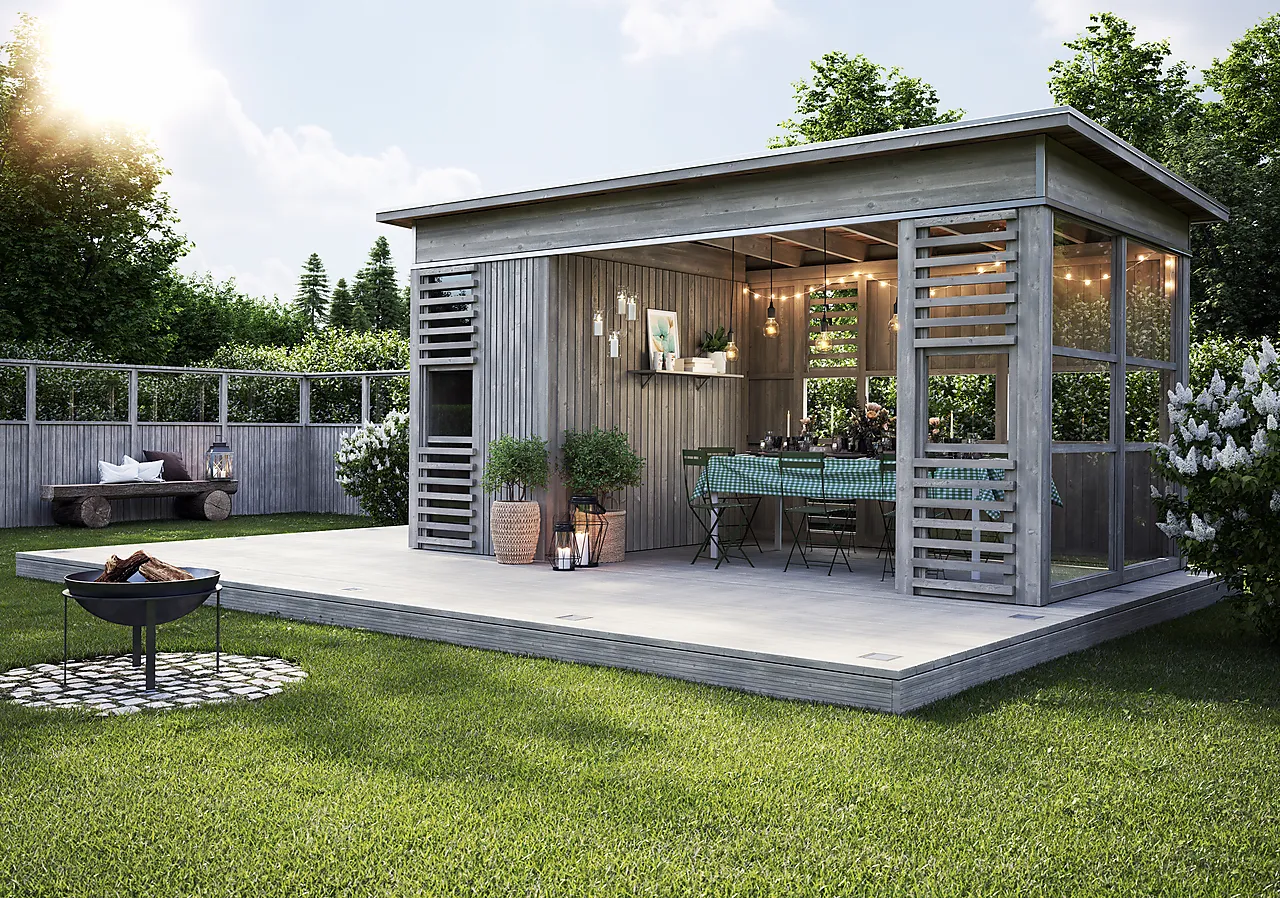 Med modell 1804 tar vi hagestuen et lite hakk videre, med noen ekstra kvm. Med 13,5 kvm. er det godt med tumleplass, både i utestuen og i boddelen. Hvor stor den enkelte delen blir kan du enkelt justere ved å flytte på elementene, og du kan også speilvende hagestuen, om du ønsker det. Totalmål: 266 x 506 cm – 13,5 M².