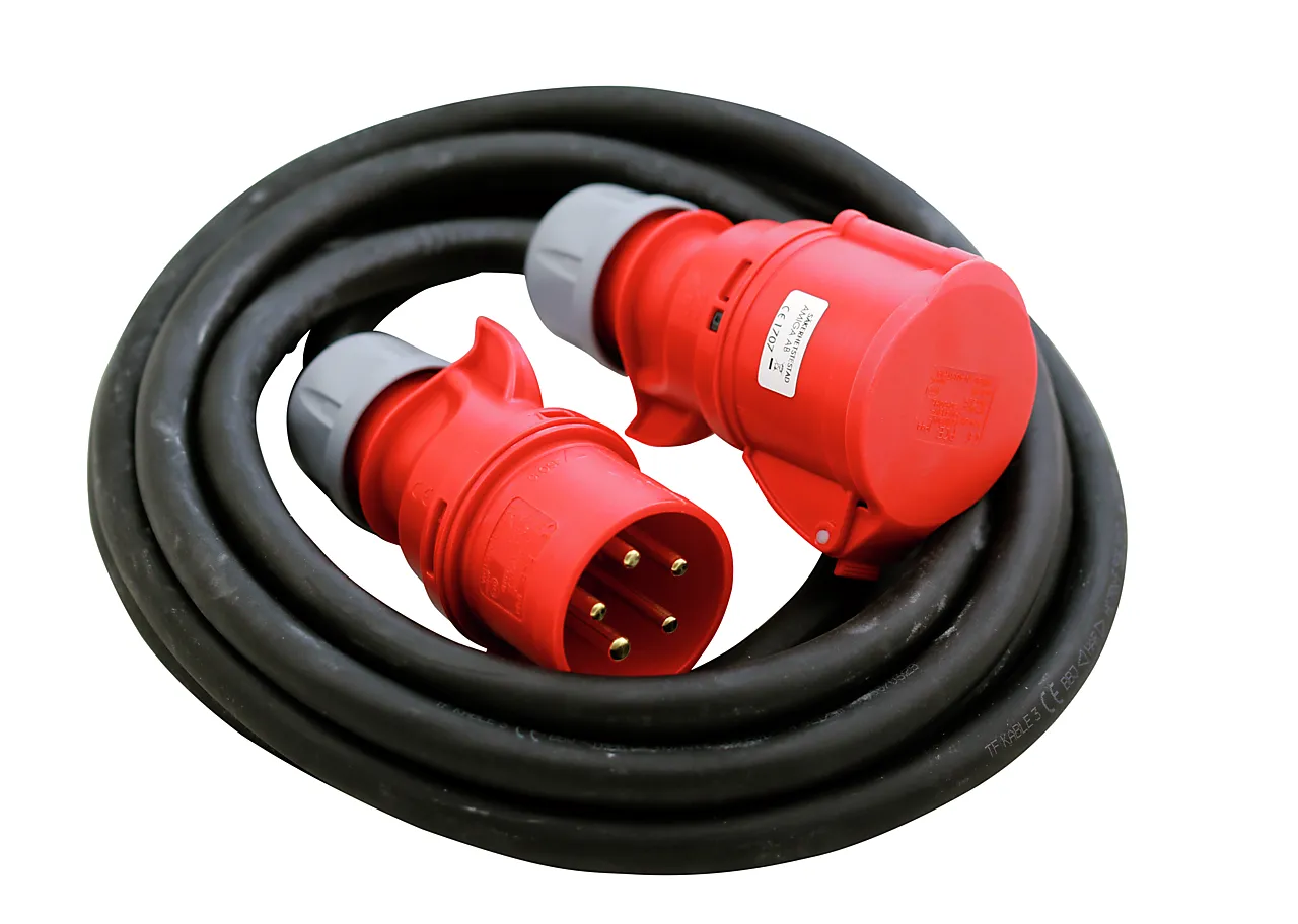 Motorkabel fra Amiga, med henholdsvis 230v og 400v. Kabelen er laget i gummi for utebruk. Runstift cee kontakter laget i gummi.