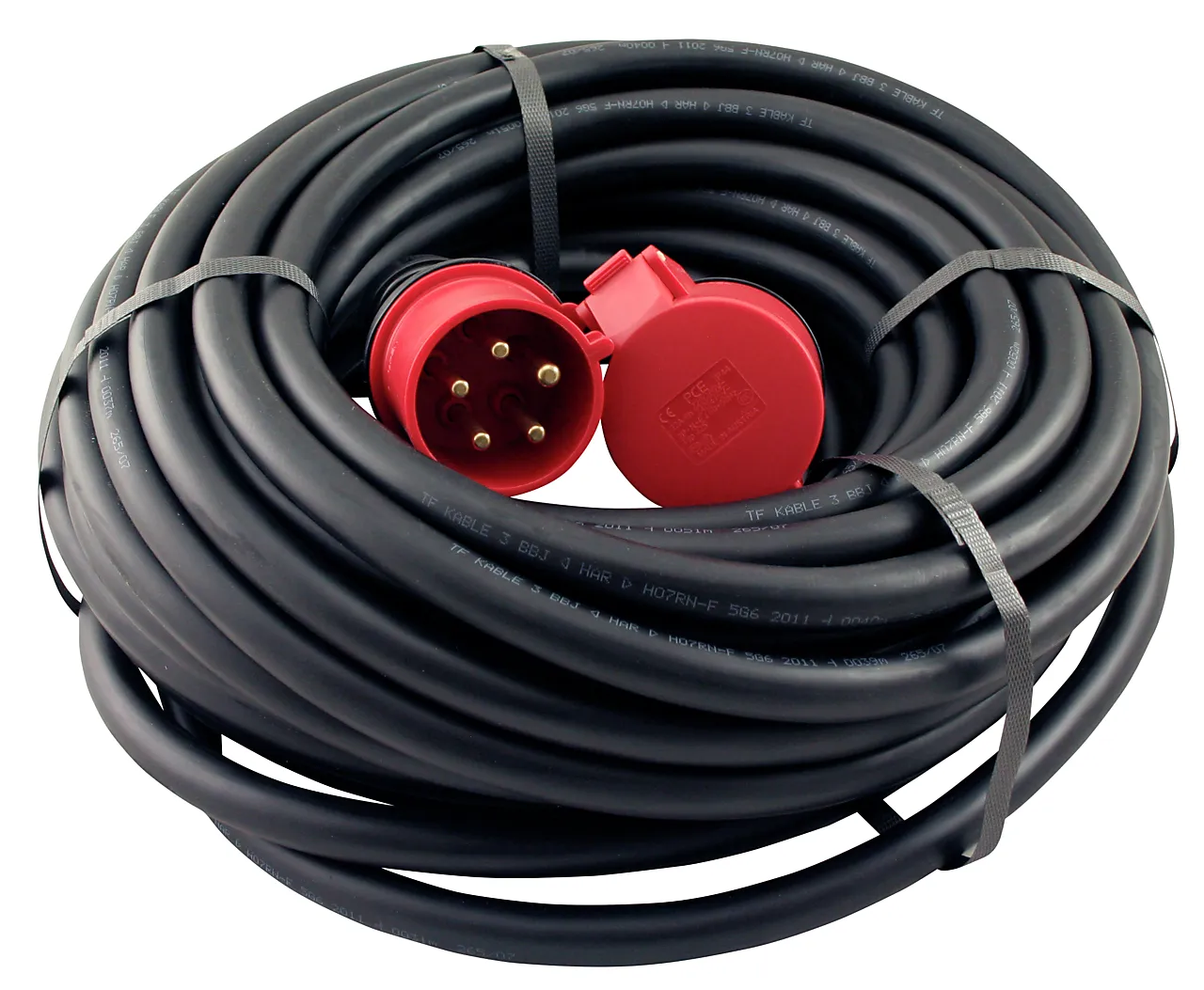 Motorkabel fra Amiga, med henholdsvis 230v og 400v. Kabelen er laget i gummi for utebruk. Runstift cee kontakter laget i gummi.