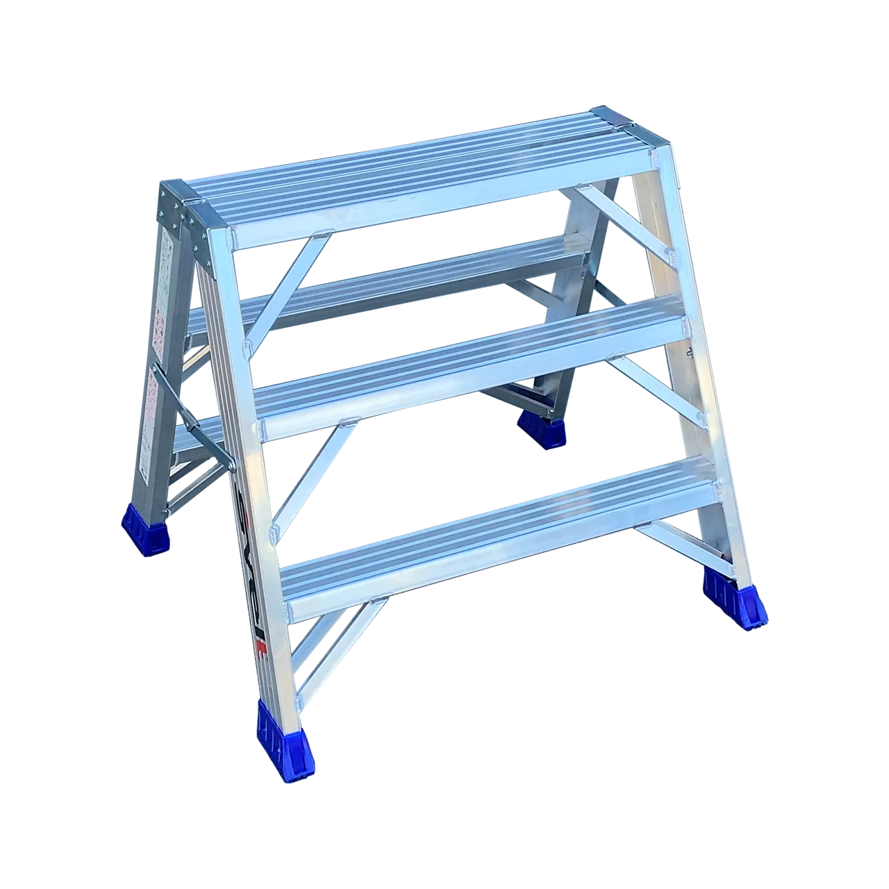 Arbeidsbukk av aluminium med brede og riflede trinn. Hvert trinn er sveiset fast til sidevangene, og den kraftige yttervangen gjør den stabil under arbeid. Arbeidsbukken har stor riflet arbeidsflate, ergonomisk sklisikre gummisko som ikke avgir merke på underlaget, og avstiverstag for økt stabilitet. Dette er en yrkesgodkjent arbeidstrapp som er egnet for tungt arbeid, og er testet og godkjent etter europeisk standard EN131. Avstand mellom trinnene er 25 cm, vangen er 80x25 mm, og bredde sammenslått er 17 cm.
