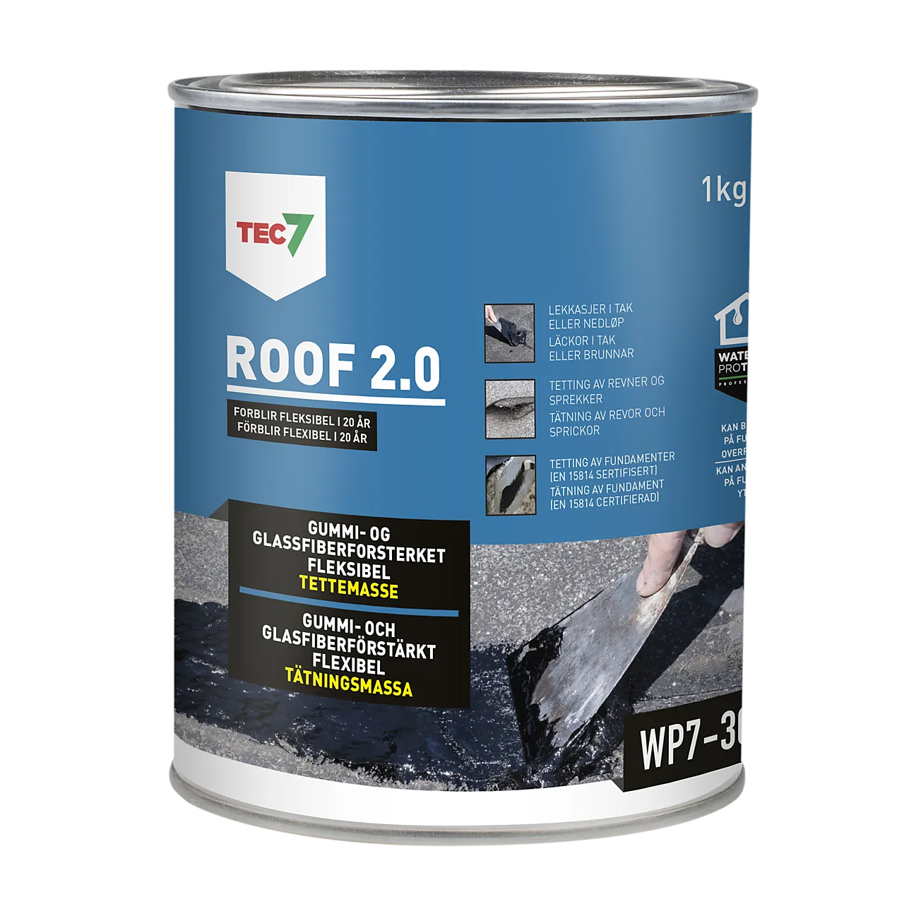 ROOF 2.0 WP7-301 er en smørbar «gummiasfalt»-masse som tetter og forsegler alle sprekker og hull på de aller fleste materialer (også våte), selv om vinteren ved temperaturer ned til -15 °C*. Den er svært elastisk og tåler forlengelse på hele 170 % uten å sprekke. ROOF 2.0 består av en blanding av butylgummi, bitumen og tråder av glassfiber. Den er svært UV-bestandig (full beskyttelse ved kun 1 mm tykkelse), noe som sammen med innholdet av butylgummi gir svært lang levetid (minimum 20 år) og varig fleksibilitet. Glassfiber sørger for god rivestyrke og bitumen gjør massen 100 % vanntett. ROOF 2.0 er godt egnet på alle områder ved taktekking, på både flate og hellende tak. Den tetter og forsegler rifter, hull, skjøter, sprekker og overganger på blant annet takpapp, takplater, takrenner og nedløp, samt alle former for installasjoner som finnes på tak; taksluk, kantbeslag, rør- og pipegjennomføringer, pipebeslag, skorsteiner, etc. Den egner seg like godt til akutte reparasjoner som varig montering av nytt utstyr. Det er ikke behov for varmebehandling for å få den til å tette, noe som er veldig tidsbesparende (ikke behov for brannvakt). Den er også fin å bruke som tetting og beskyttelse på alt fra fundamenter, vegger, kummer og dreneringer, til å tette fuger i gamle trebåter. ROOF 2.0 er i tillegg sertifisert etter EU standarden EN 15814 som omhandler vanntetting av fundamenter under bakkenivå.