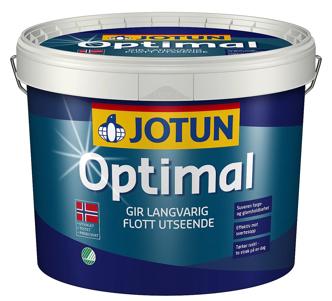 Optimal husmaling er tilpasset det norske klimaet og er tilsatt effektive midler mot svertesopp. Moderne teknologi gjør at farge og glans holder seg like flott i år etter år, samtidig som malingen tar opp minimalt med skitt. God fargestabilitet og lange vedlikeholdsintervaller. Tørker raskt, og kan overmales etter 2 timer. NB! Vi selger kun hvit maling på nett. Skal du ha en annen farge må den blandes, og kjøpes direkte i et av våre varehus.