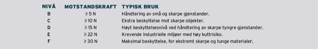 Kuttvern handler om hvor mye kraft en hanske tåler før et skarpt blad skjærer tvers gjennom materialet. Denne motstandskraften måles i newton (N). Jo høyere tall, desto mer kraft må til for å kutte hull.