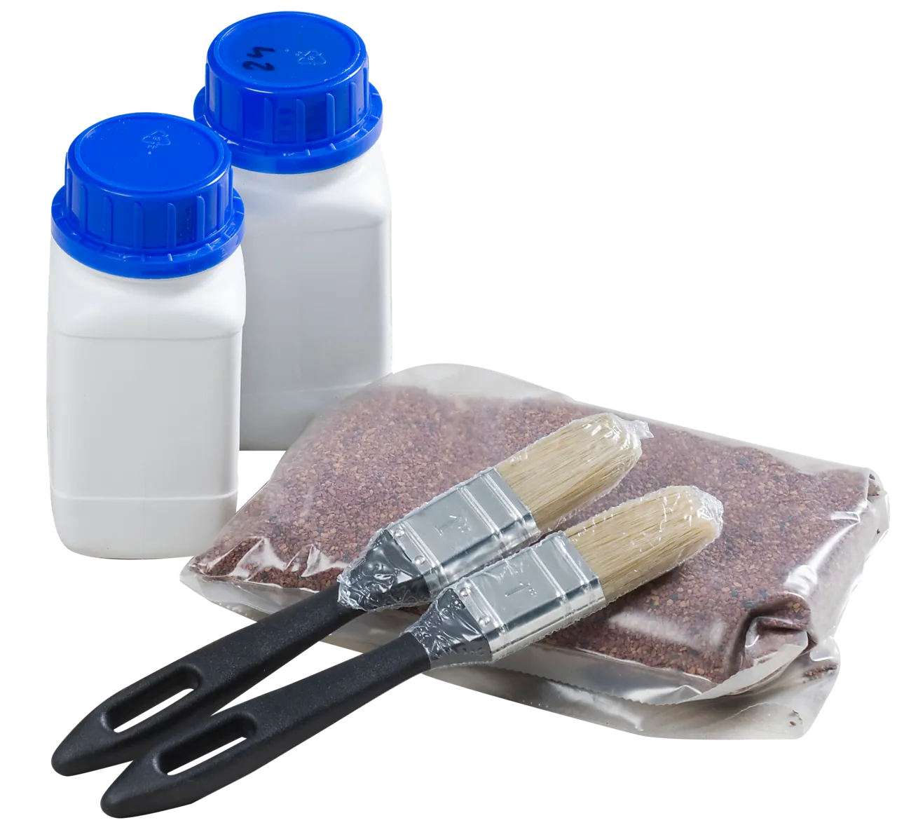 Reparasjonssett for sår og skader i overflaten på Powertekk Nordic takplater og tilbehør. Settet består av grunnfarge, granulat og klarlakk i samme farge som takplatene og tilbehøret, og inngår i Powertekk taksystem.