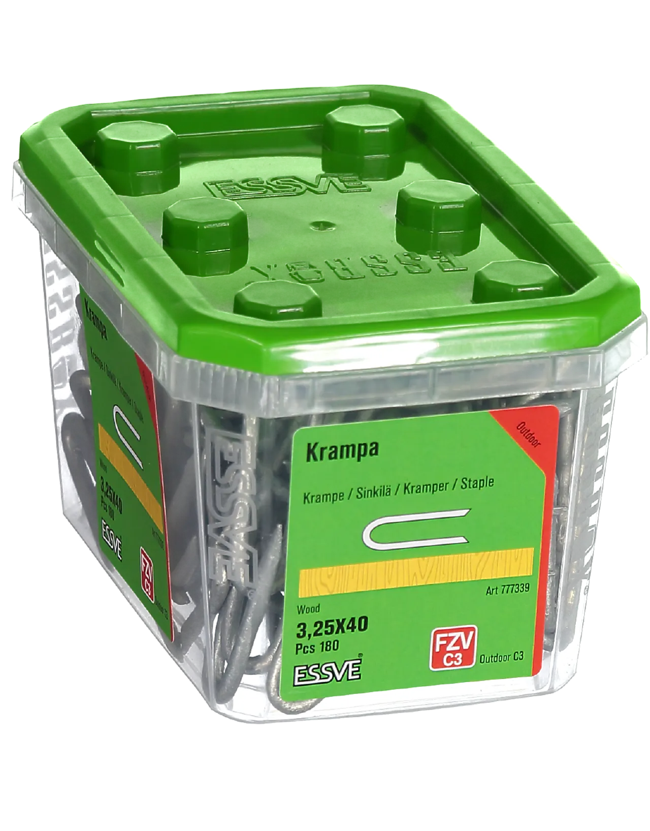 ESSVE Krampe FZV er beregnet for oppsetting av porter, tråd, nett m m. utendørs der det forekommer krav til rustbeskyttelse.