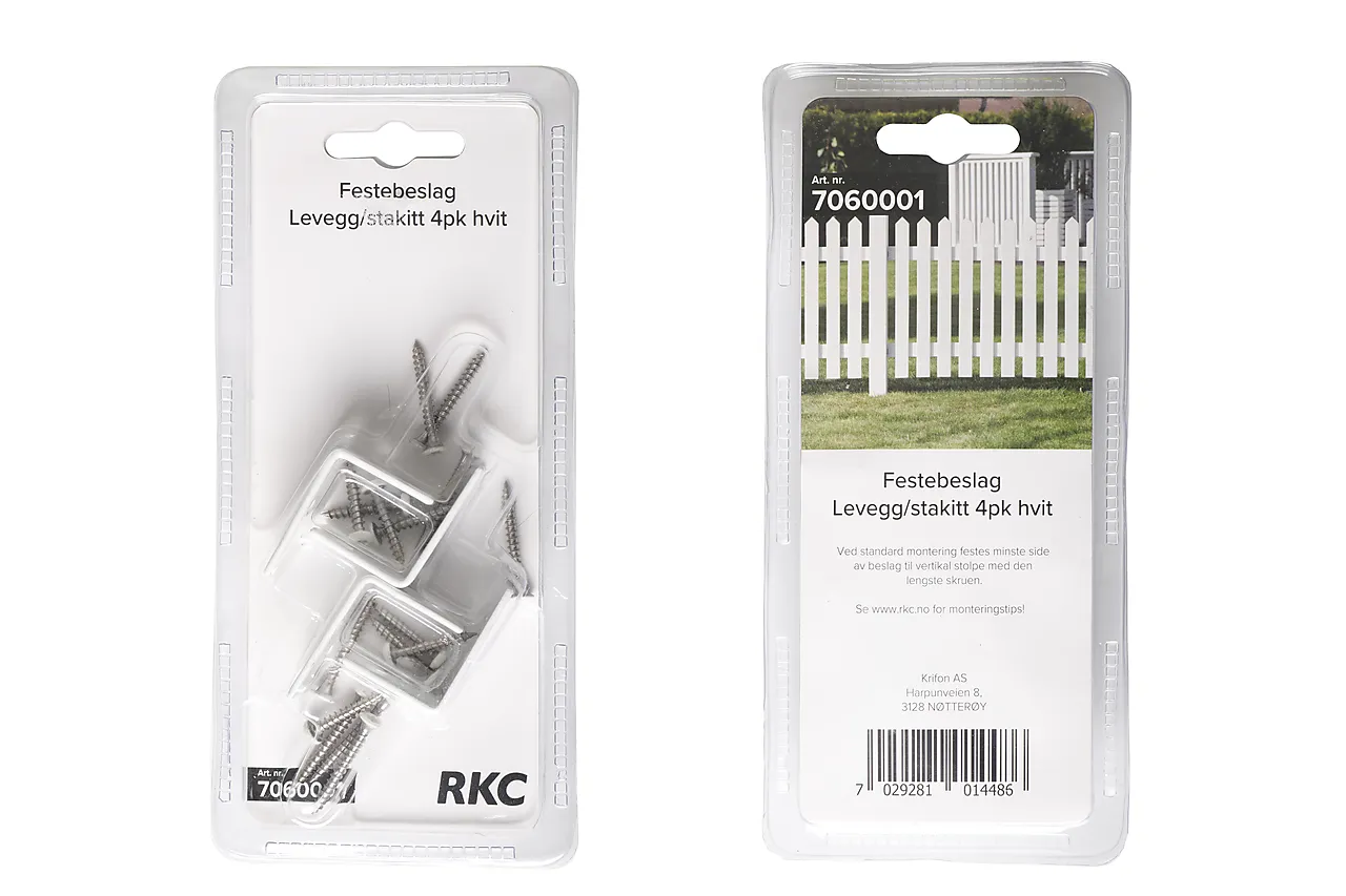Festebeslag /vinkelbeslag for montering av RKC levegg, rekkverk, stakitt og gjerde. Beslag og skruehoder lakkert i matchende RAL 9016 hvit. Finnes også i sort og galvanisert.