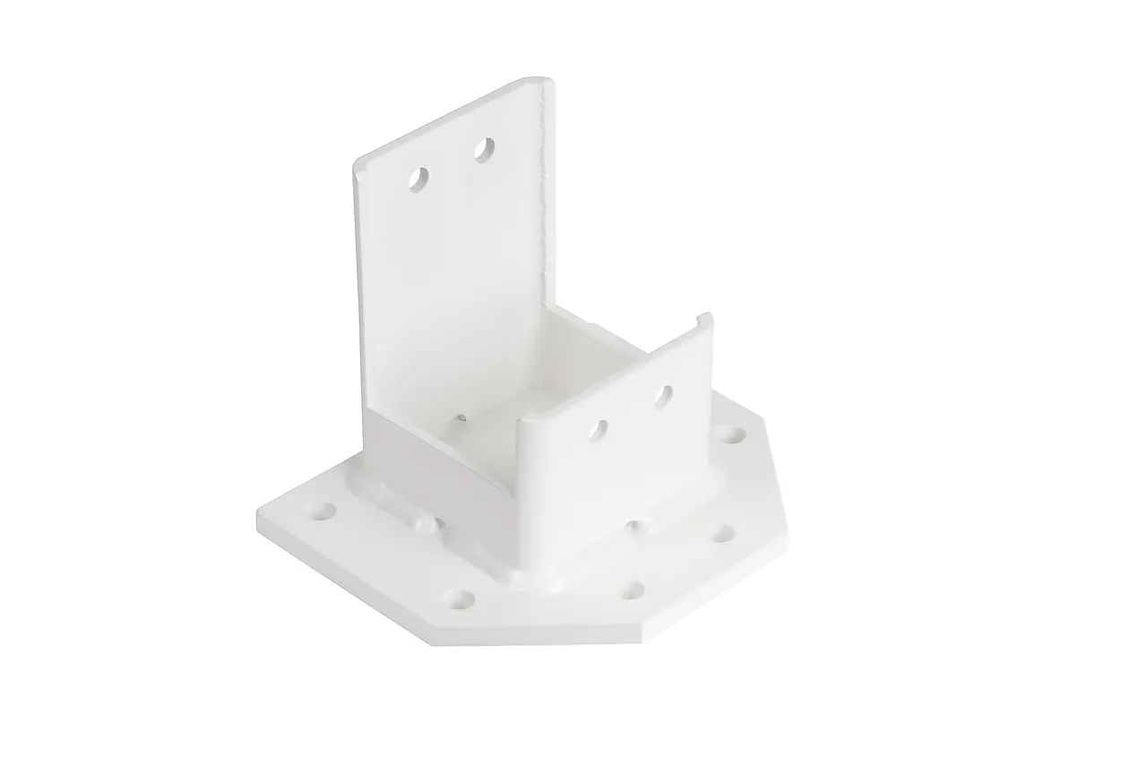Stolpefot Idyll for midtstolpe med spor til glasselement. Mål (bxdxh): 18,4x15,2x15 cm. Hvitlakkert (varmgalvanisert + lakkert). Testet av SINTEF.