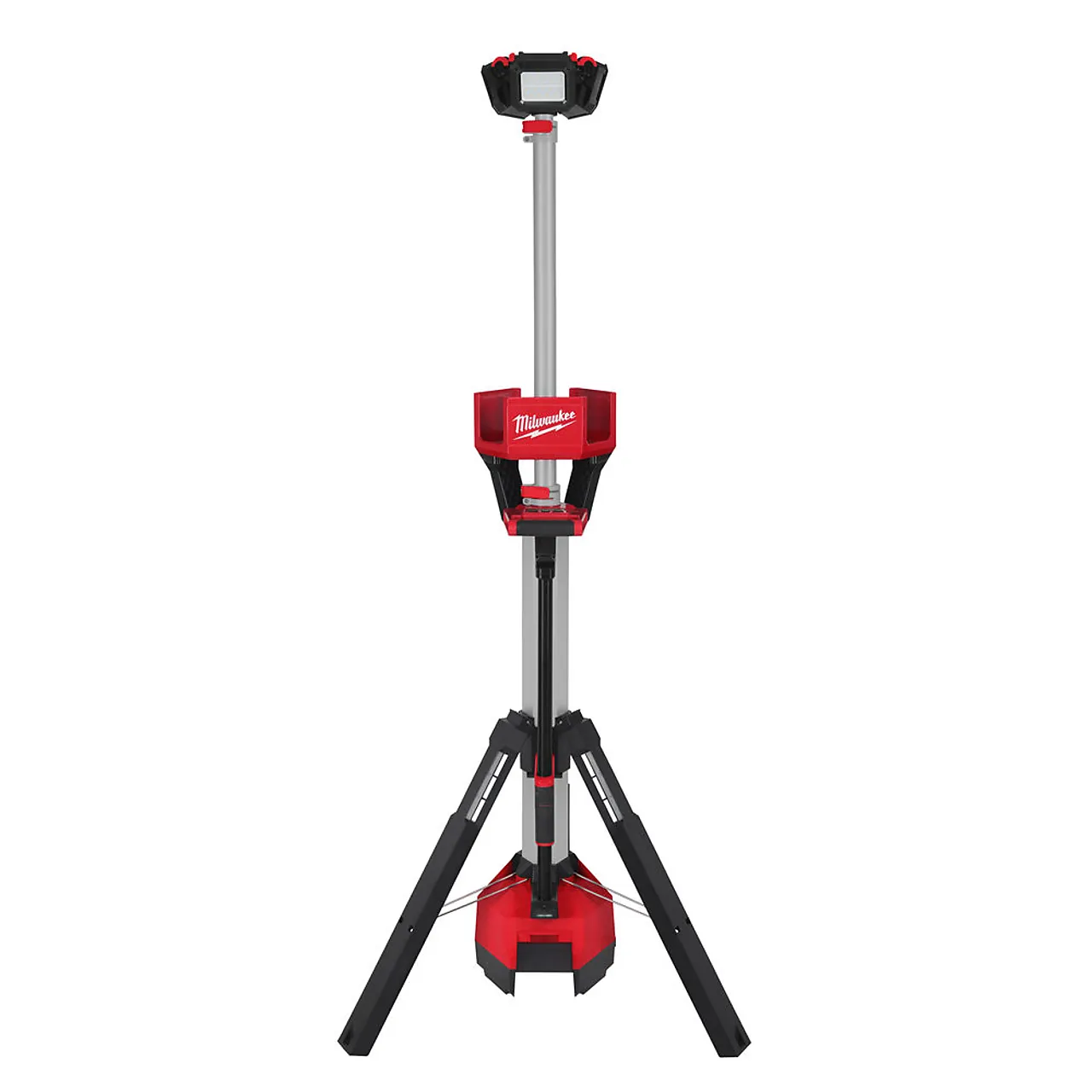 Milwaukee arbeidslampe på stativ drives av M18-batterier eller direkte på strømnett. Lampen har opp til 10 timers driftstid under batteridrift på opptil 6000 lumen. Masten er utvidbar fra 1-2,2 meter for å lyse opp arbeidsområder fra toppen uten å lage skygger. Fotavtrykket er kompakt med lavt tyngdepunkt og slagbestandige ben for å beskytte mot voldsomme arbeidsforhold. Håndtakene er av full lengde som forenkler transporten. Batteriindikatoren lyser når batterinivået begynner å bli lavt. USB-uttak for lading av ekstrautstyr og telefoner.