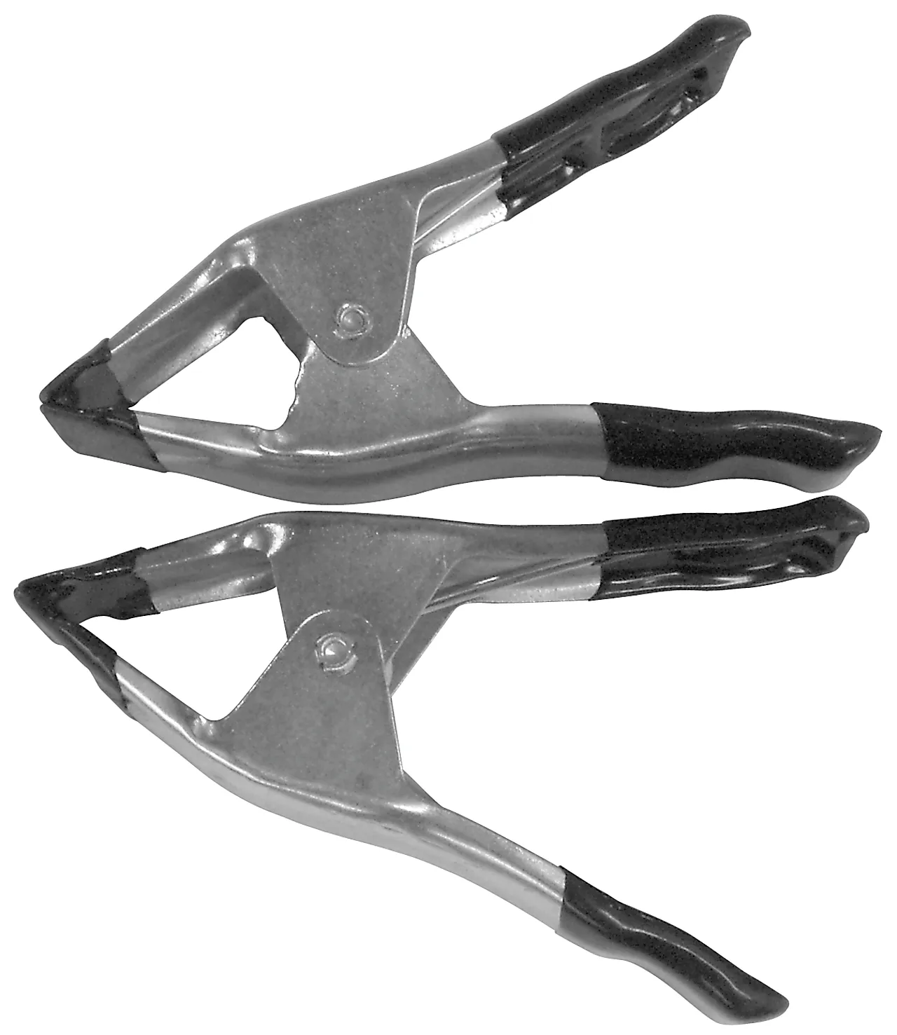 Limklemme i stål, med kraftig fjær. Plastbelagte håndtak og pressflater. Leveres i par.