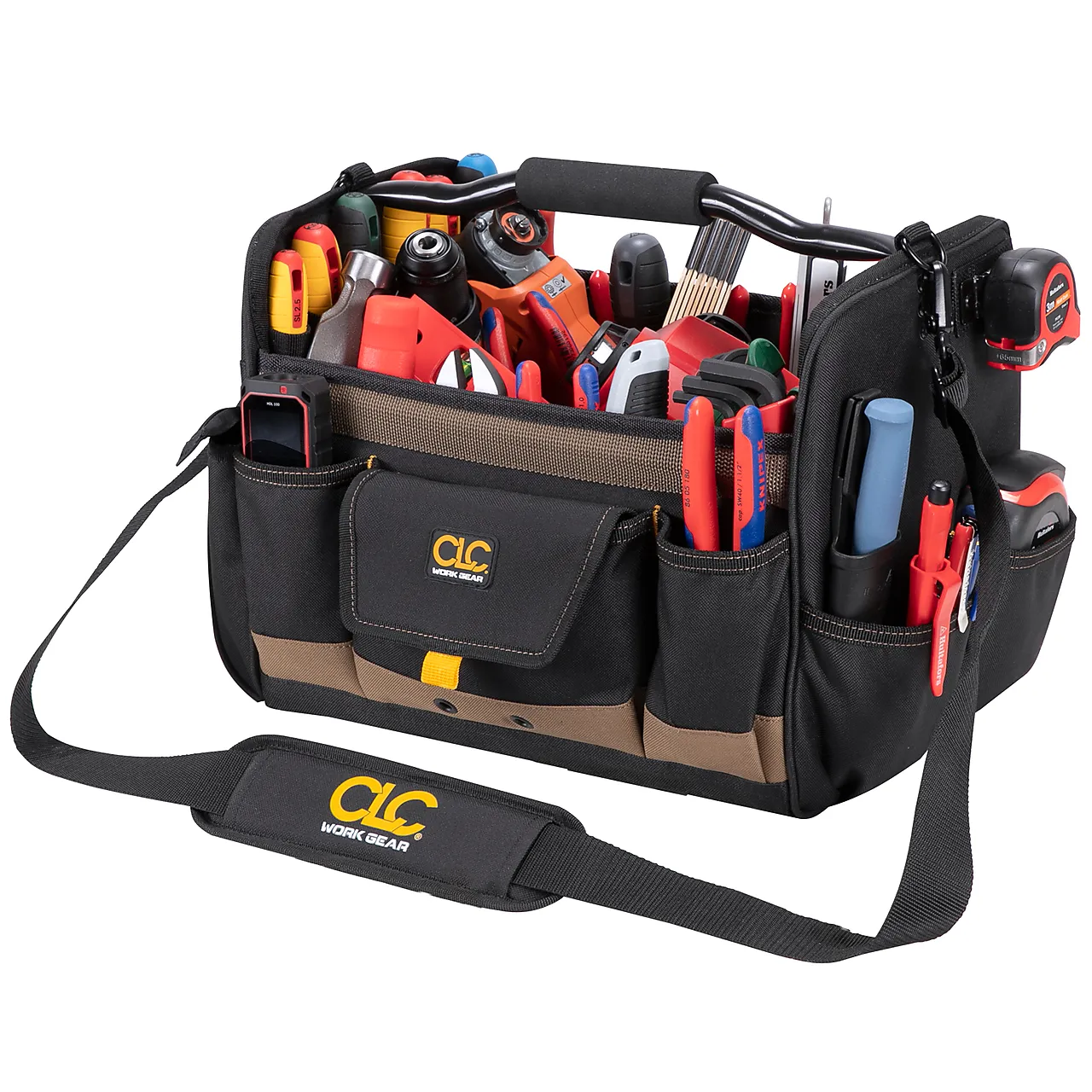 Praktisk verktøykasse med 21 lommer. Her er det god plass til verktøyet og ved hjelp av lommene er det enkelt å holde god orden på de ulike verktøyene slik at de er lett å finne igjen når du trenger de. Stor flate i midten som gir rom for større verktøy. Den åpne toppen gir god tilgang til verktøyet og praktisk stanghåndtak som er dekket av skum for et godt grep og behagelig å bære med seg. Polstret skulderrem. Egen hempe til elektrikertape og klips til målebånd. Egen lomme som åpnes og lukkes med glidelås, ypperlig til oppbevaring av verdisaker. Mål på verktøykassen er 36x28x28 cm.