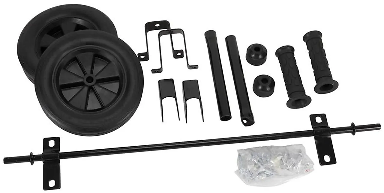 Settet består av 2 hjul, hjulaksel, 2 håndtak og skruesett til sammenmontering.
